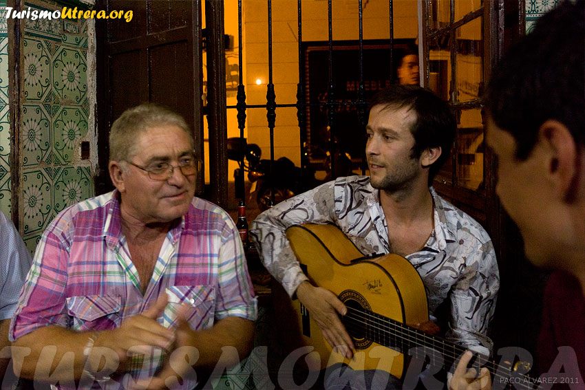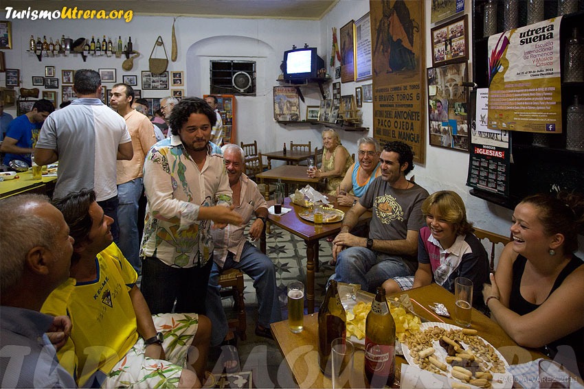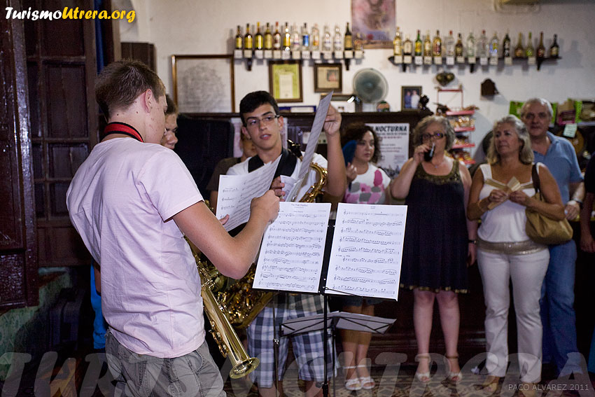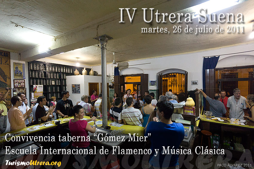 UTRERA SUENAPRESENTACIÓNBASESDETALLES El día 26 prosiguió la jornada de clases mañana y tarde , por la noche a las 22horas se celebró una convivencia especial, los alumnos fundieron la música y el cante en un pintoresco entorno como es la mítica “Taberna de Gómez Mier” situada en la calle Sevilla. Inauguraron los alumnos de metales, que interpretaron tres simpáticos temas musicales, posteriormente a lo largo de la noche se fueron destilando cantes y sones de guitarra y cajón flamenco, no había ningún guión preestablecido y sin pensarlo se fueron sumando varios espontáneos clientes de la taberna que, unos más y otros menos, se atrevieron con varios palos flamencos. Los alumnos que no conocían Utrera se quedaron maravillados por el ambiente “Andaluz y Flamenco” de taberna con solera, cuando vuelvan a sus países podrán contar que han estado en Utrera, una de las cunas del cante flamenco.